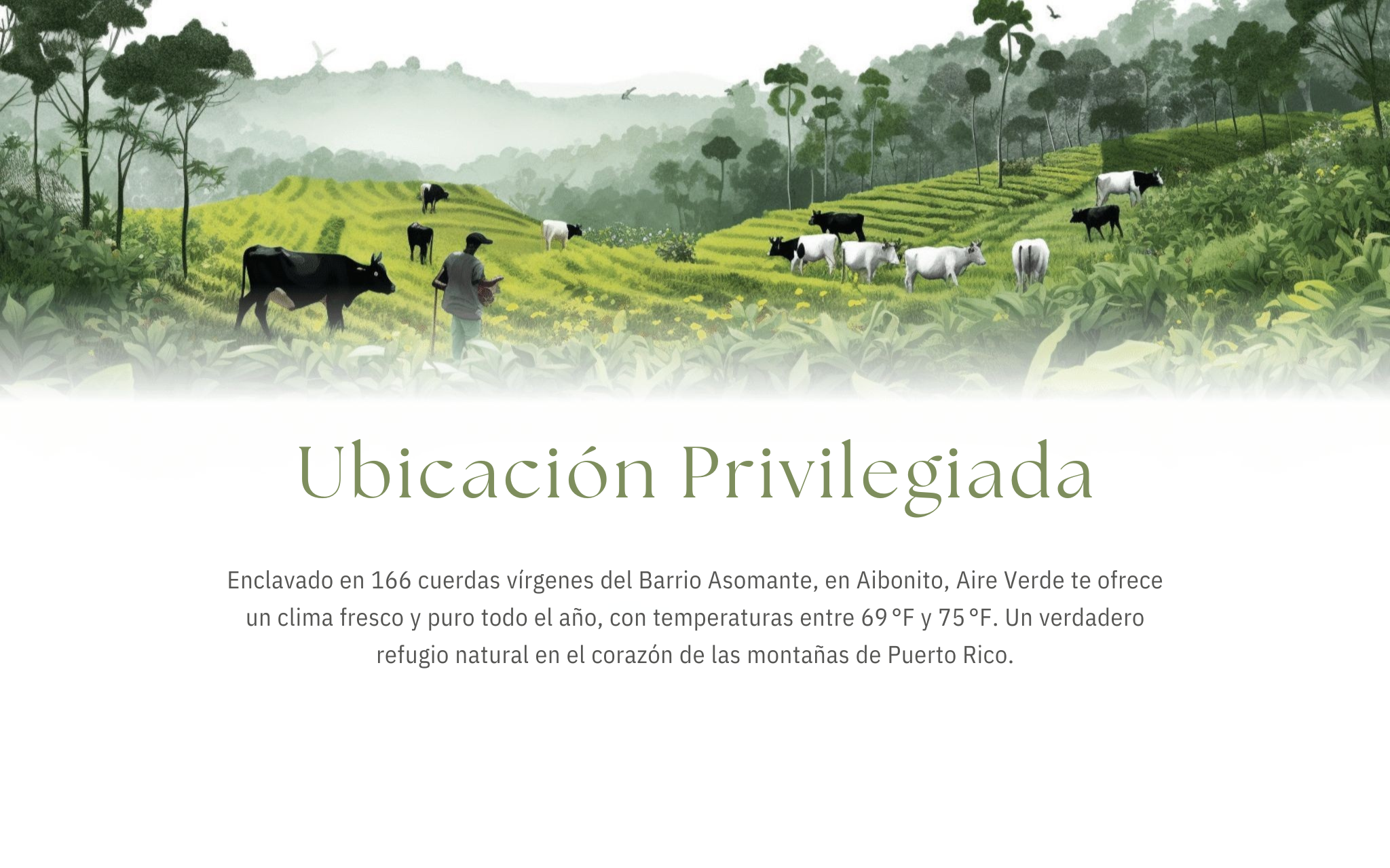 Aire Verde está localizado en 166 cuerdas vírgenes en el Barrio Asomante de Aibonito, en las montañas de Puerto Rico dónde el clima es siempre fresco y puro, entre 69 y 75 grados fahrenheit.